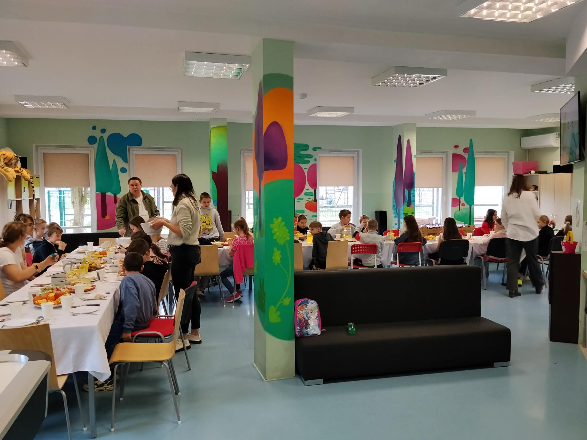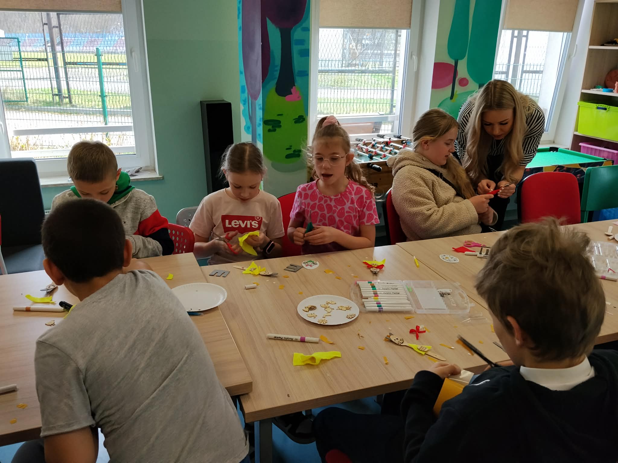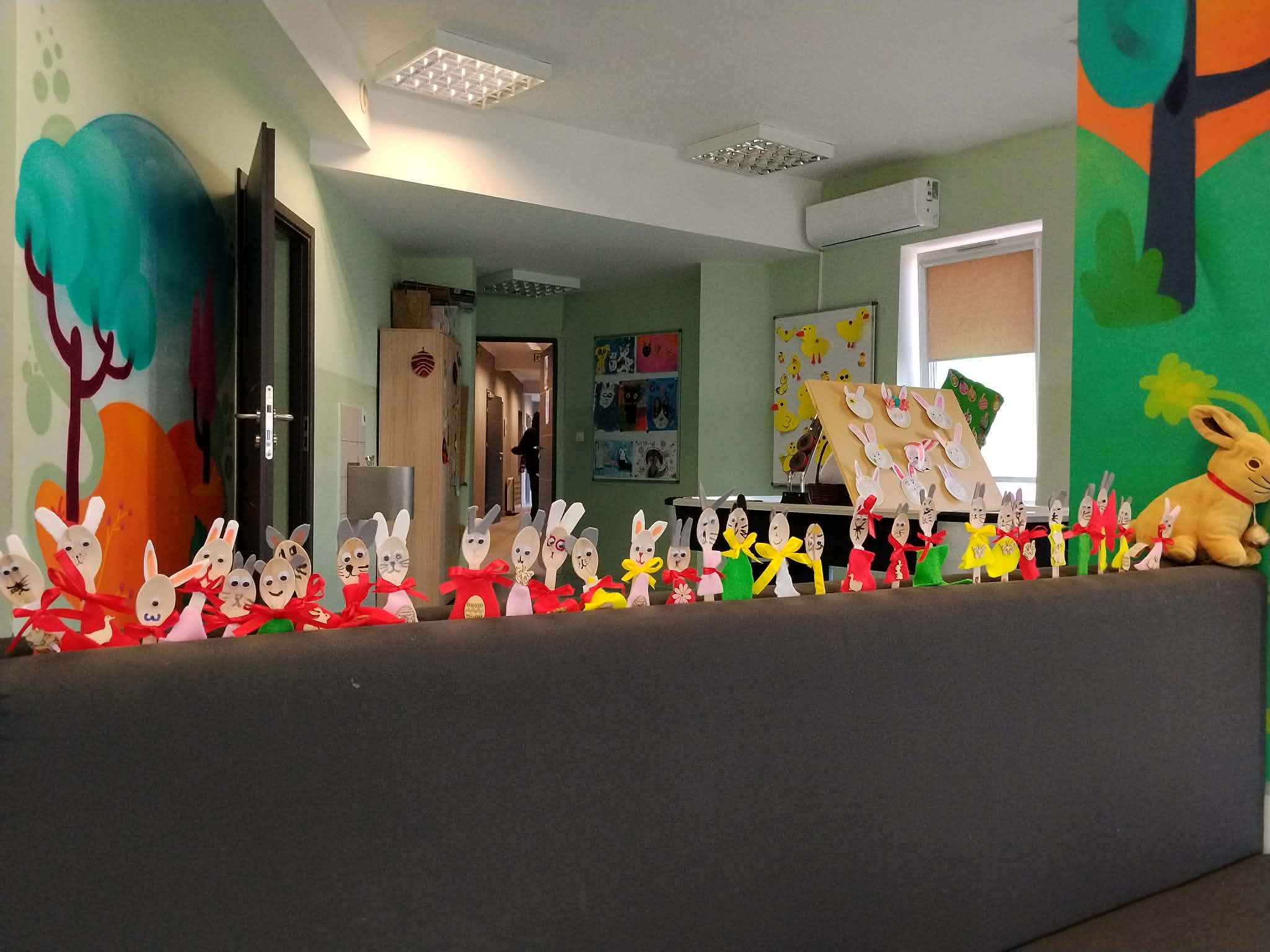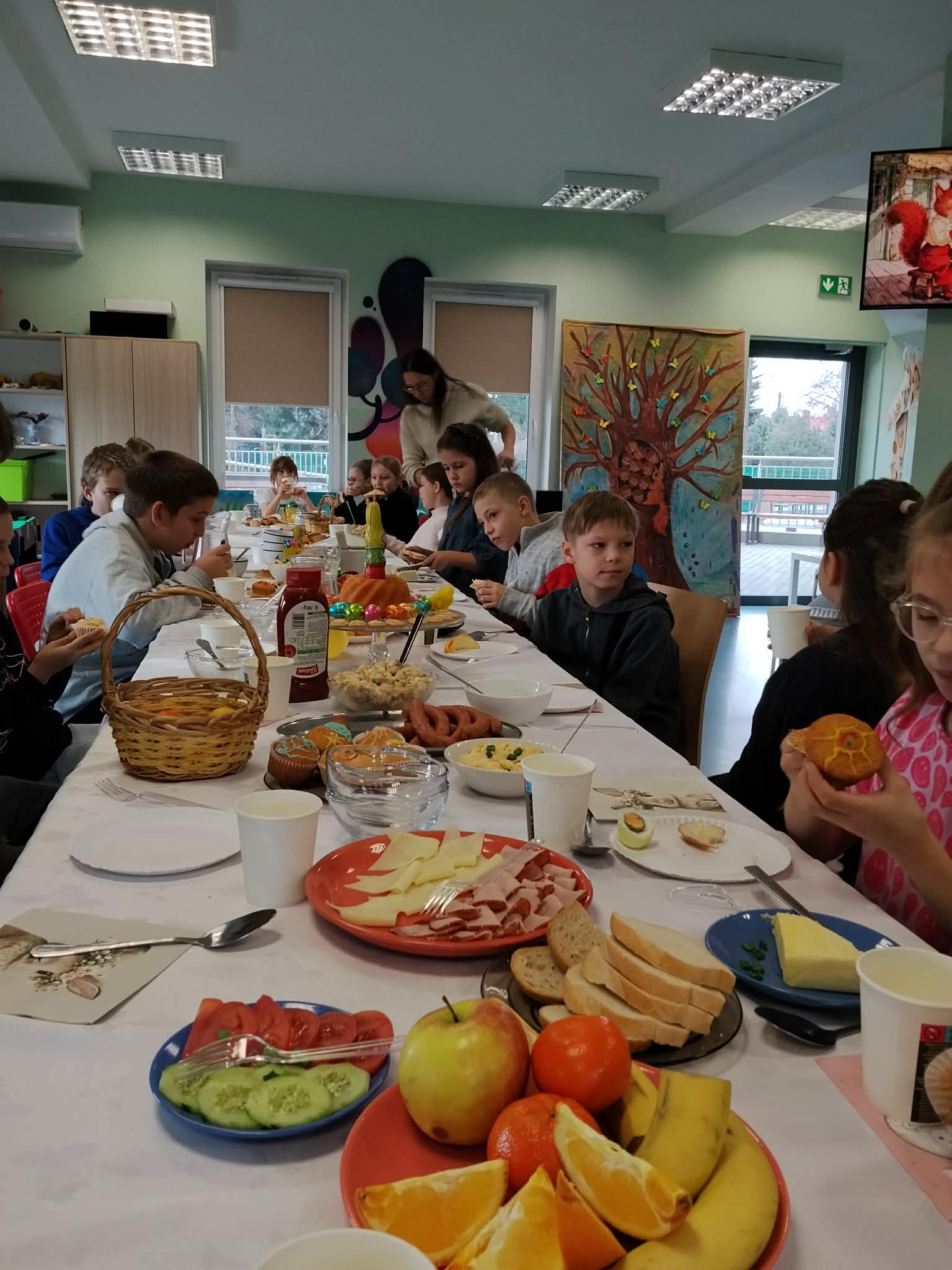 Dziś w głównej siedzibie świąteczne śniadanie. Spotkaliśmy się, aby pobyć razem. Posłuchaliśmy o Wielkanocnych tradycjach, zjedliśmy świąteczne potrawy. Był pyszny żurek, kiełbaski, jajka, pasta jajeczna, szyneczki, kanapeczki, sałatka, nie zabrało też babki,babeczek oraz słodyczy i owoców. Z pełnymi brzuszkami poszliśmy na podwórko szukać czekoladowych jajeczek, sprytnie ukrytych. Wszystkie zostały odnalezione. Brawo! Później odbyły się zajęcia kreatywne, najpierw kolorowaliśmy piankowe pisanki a potem robiliśmy króliki z drewnianych łyżeczek. Cuda powstały! Każdy z obecnych podopiecznych otrzymał też prezent. Na koniec przyszedł czas na wspólne gry i zabawy. Wspaniale przeżyliśmy dzisiejszy poranek.